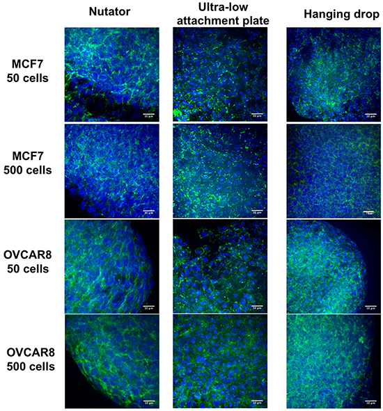 MCF7 or OVCAR8 cells were cultured in growth media until 70% confluency was reached. Cells were trypsinized as per a regular passage and counted using a hemocytometer. Cell dilutions were adjusted in such a way that a 20-50μl volume contained either 50 or 500 cells. Three methods were utilized to generate spheroids: 1) hanging drop array plates; 2) ultra-low attachment plates; and 3) ultra-low attachment plates with a 48-hour nutation period (nutator plates).