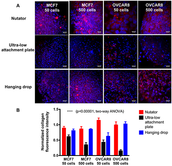 Spheroids were harvested onto a soft bed of 2% agarose on a microscope slide, using 200μl micro-pipets. Care was taken so as not to disturb the spheroids while transferring them to be embedded onto agarose for further immunohistochemical staining. Spheroids were fixed in 4% neutral buffered formalin, blocked with 10% goat serum and mildly permeabilized using 0.1% Triton-X. Alexafluor488-conjugated phalloidin was utilized to visualize actin cytoskeletons in spheroids generated on hanging drop array plates, nutator plates and ultra-low attachment plates. Collagen staining was carried out by a 1-hour incubation with the rabbit polycloncal anti-Collagen type I antibody (Abcam), followed by three washes to remove unbound antibody and a subsequent 1-hour incubation with TRITC-conjugated anti-rabbit secondary antibody. All spheroid samples (nutator, ultra-low attachment plates, and hanging drop arrays) were treated with the same titer for both primary and fluorophore conjugated secondary antibodies. Nuclei were counterstained with DAPI. Fluorescence for nuclei, actin network staining or collagen type I was visualized using a confocal microscope (Olympus IX81, equipped with a Yokogawa CSU-X1 confocal scanning laser unit, Andor iXon x3 CCD camera, and Metamorph 7.8 software). All spheroid samples were imaged at the same gain and exposure setting (800 millisecond) for red TRITC collagen type I fluorescence. The blue DAPI counterstain was also obtained at identical gain and exposure settings (40 millisecond) between samples to visualize nuclei within the spheroids. A range of z-stacks were obtained for each spheroid imaged, and a reconstruction of an XY image was created using Metamorph for Olympus software. All images were obtained on a 10X magnification for fluorometric quantification in order to visualize the entire spheroid. The 3D reconstructions of MCF7 or OVCAR8 spheroids generated on nutator, ultra-low attachment plates or hanging drop arrays were imported into Image J and a histogram was generated to read the mean intensity on the red (collagen type I) and blue (nuclei) channels. The red collagen intensity was normalized to the blue nuclei intensity to obtain normalized collagen intensity per spheroid, to compare spheroids among platforms.