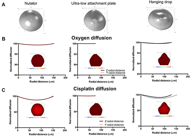 Figure 9B demonstrates changes in oxygen diffusion in the y and z depth axes of MCF7 spheroids generated on nutator, ultra-low attachment or hanging drop array plates. Model data demonstrates that oxygen diffusion dropped less than 0.7% in either of the depth directions of all MCF7 spheroids at their core, with the lowest drop in oxygen amounting to 99.3% (Figure 9B). Cisplatin concentration gradients were significantly sharper on spheroids generated on nutator or hanging drop plates dropping to 85.19% and 83.96% of the original concentration respectively. In contrast, cisplatin concentration only dropped to 96.85% in MCF7 spheroids generated on ultra low attachment plates (Figure 9C). Graphical plots representing change in oxygen and cisplatin concentration in MCF7 spheroids along with representative gradient plots are shown in Figure 9B, 9C.