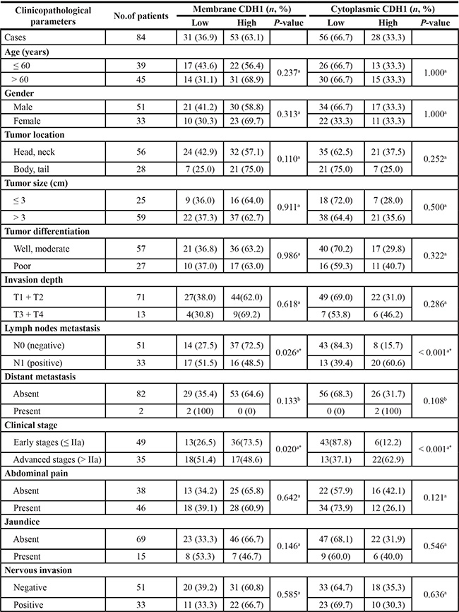 Table 1: Comparisons with CDH1 expression between PC and paired adjacent normal tissues (n = 84)