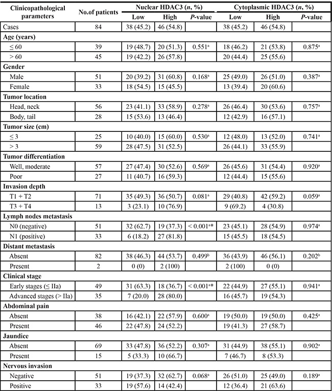Table 5: Correlation between the clinicopathologic characteristics and HDAC3 expression (n = 84)