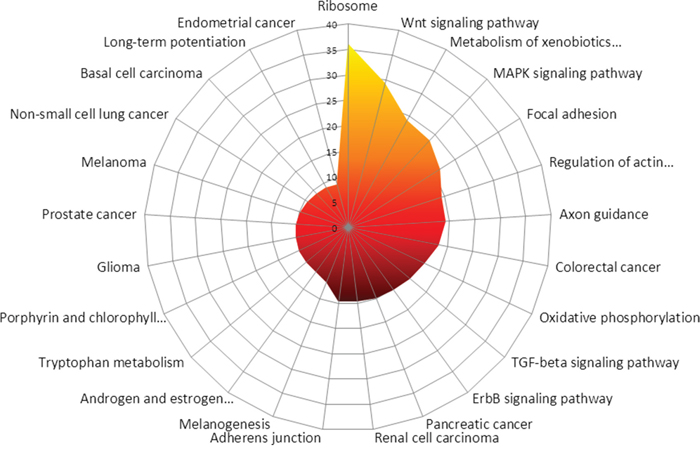 Figure 2: In silico prediction of the most affected KEGG-pathways between MDM2-positive and negative tumours is shown. Most likely affected are Ribosome, Wnt signaling pathway, Metabolism of xenobiotics by cytochrome P450, MAPK signaling pathway, focal adhesion, regulation of actin cytoskeleton, Axon guidance, Colorectal cancer, Oxidative phosphorylation as well as TGF-beta signaling pathway.