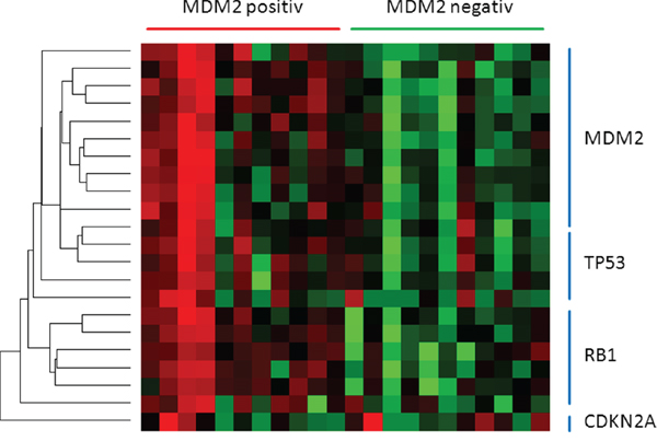 Figure 3: The heatmap presents miRNAs directing TP53 pathway members. miRNAs regulating either MDM2, TP53 or RB1 are downregulated in MDM2-positiv tumours. CDKN2A seems to be unaffected.