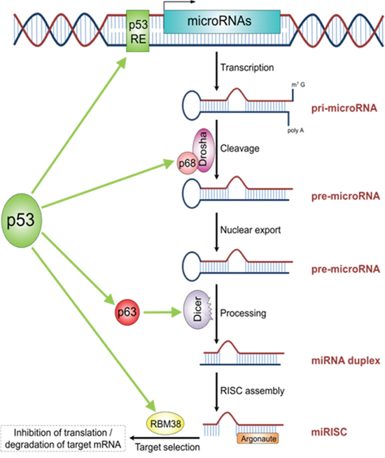 Figure 4: The schematic illustrations describes the role of TP53 in miRNA processing and regulation. TP53 acts as transcription factor for some miRNAs. Additionally, TP53 plays a role in miRNA processing by directly interacting with P68 (DROSHA-complex), P63 (DICER-complex) as well as RBM38. The figure is adapted from Rokavec et al. Clin Exp Gastroenterol, 2014 [44].