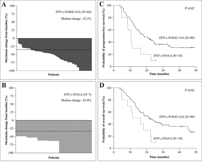(N) number of patients; (HR) hazard ratio; (CI) confidence interval. Significant differences between groups are presented in bold letters. In multivariate Cox analysis (adjusted by tumor stage and XPD c.934G>A polymorphism): *P= 0.07, HR: 6.15, 95% CI: 0.84-44.68; **P= 0.06, HR: 6.59, 95% CI: 0.90-47.90; ***P= 0.03, HR: 2.13, 95% CI: 1.04-4.38; ****P= 0.05, HR: 2.04, 95% CI: 1.00-4.20.