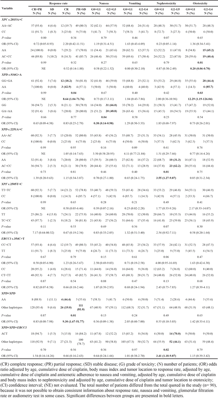 The differences between groups were analyzed by chi-square (χ2) or Fisher’s exact test. Logistic regression model served to obtain odds ratios values, adjusted for clinicopathological aspects with P-values ≤ 0.10, with 95% confidence intervals (95% CI), to assess associations between SNPs genotypes, RR, nausea, vomiting, hematologic toxicities, nephrotoxicity and ototoxicity. ANOVA served to obtain values, adjusted for clinicopathological aspects with P-values ≤ 0.10, in assessment of associations between SNPs genotypes and urinary CDDP. This variable was transformed into ranks to perform the comparative analysis, since it was not normally distributed.