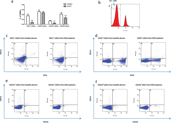 Figure 1: The percentages of circulating DCs subsets among PBMCs in healthy donors and ESCC patients. The percentages of circulating DCs subtypes depicted in the histogram in a. Lin- PBMCs as a gating strategy in b. Specifically, the representative FACS plots of CD11c+ CD1c+ in c. CD11c+ CD16+ in d. CD11c+ CD141+ in e. CD11c- CD123+ in f. 10,000 events were acquired for each sample. **P<0.01 versus healthy controls.