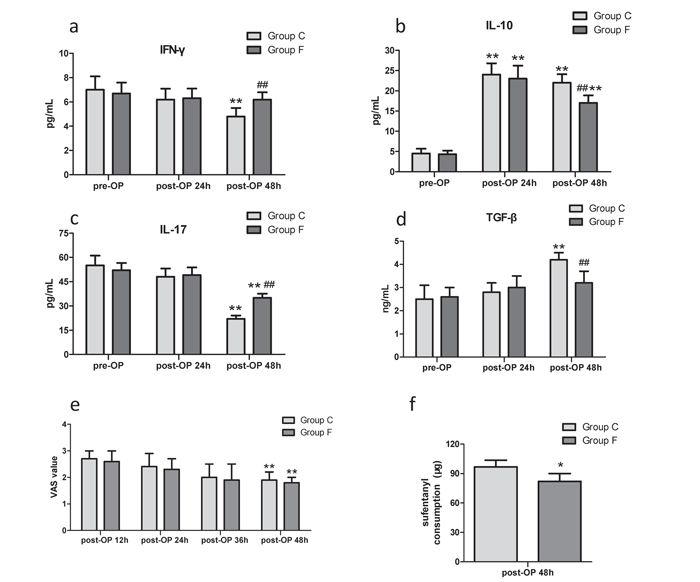 Figure 3: IFN-γ and IL-17 levels in group F and group C in a and c. IL-10 and TGF-β levels in group F and group C in b and d. **P<0.01 versus pre-OP baseline level. ##P<0.01 versus patients received placebo in group C. No significant difference in VAS scores between groups in e. **P<0.01 versus post-OP 12h. Sufentanil consumption during post-OP 24h in group F was significantly less in f. *P<0.05 versus patients received placebo in group C.
