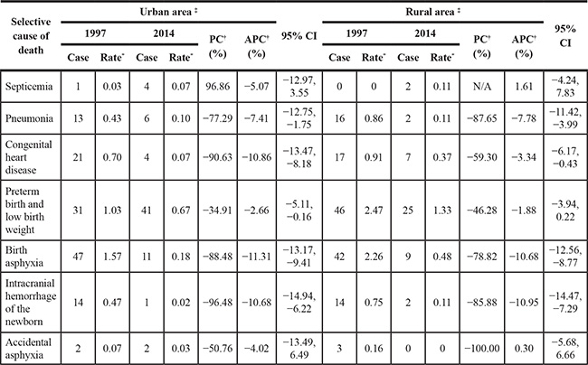 Table 6: Trends in neonatal mortality rate of selective causes in Shenyang by urban and rural area in 1997–2014