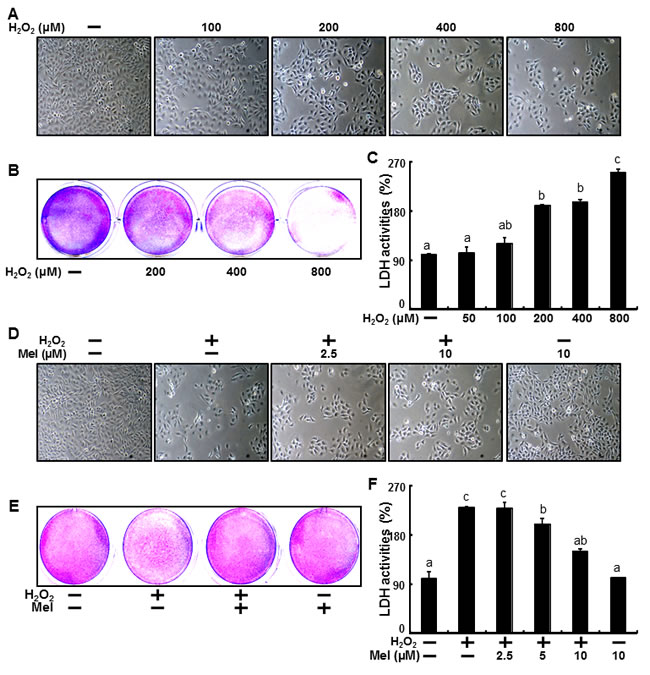 Figure 1: Melatonin prevents hydrogen peroxide-induced human keratinocyte cell death. HaCaT keratinocytes were exposed to 100, 200, 400 and 800 μM of H2O2 for 18 hr. Treated cells were photographed using light microscopy A. and cell viability was measured via crystal violet staining. Viability of the control cells was set at 100% and viability relative to the control was measured B.. LDH activity was measured by quantifying LDH released in the medium C.. HaCaT keratinocytes were pretreated with melatonin (2.5, 5, and 10 μM) for 12 hr and exposed to 800 μM of H2O2, for 18 h. Treated cells were photographed using light microscopy D. and cell viability was measured via crystal violet staining. Viability of the control cells was set at 100% and viability relative to the control was measured E.. LDH activity was measured by quantifying LDH released in the medium F.. The data were analyzed using ANOVA and Tukey multiple range tests (P < 0.01). Means sharing a common alphabetical symbol did not significantly differ.