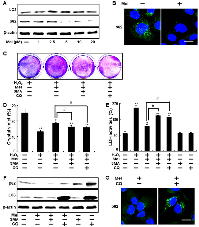 Figure 2: Melatonin-induced autophagy prevents the hydrogen peroxide-mediated human keratinocytes damage. HaCaT keratinocytes were treated with melatonin at different concentrations (1~20 μM) with or without H2O2 (800 μM) for 24 hr. Western blot analysis of LC3-II and p62 proteins was conducted from the HaCaT keratinocytes A.. The melatonin-treated cells were immunostained with DAPI (blue) and p62 antibody (green) and fluorescence was examined B.. HaCaT keratinocytes were pretreated with melatonin (10 μM) for 12 hr in the presence of autophagy inhibitors, 3MA (1 mM) and CQ (10 μM), and then exposed to 800 μM of H2O2 for 18 hr. Cell viability was measured using crystal violet staining. Viability of the control cells was set at 100% and viability relative to the control was measured C. D.. LDH activities were measured by quantifying LDH released in the medium E.. HaCaT keratinocytes were pretreated with melatonin (10 μM) in the presence of 3MA (1 mM) and CQ (10 μM) and then exposed to 800 μM of H2O2 for 12 h. Western blot analysis of LC3-II and p62 proteins was conducted from the HaCaT keratinocytes. β-actin was used as the loading control F.. HaCaT keratinocytes were analyzed by immunocytochemistry for p62 G.. The cells were immunostained with p62 antibody (green) and observed in the fluorescent view. Scale bar: 10 μm. The bar graph indicates the mean ± standard error of the mean (SEM) (n = 4). * p < 0.05 and ** p < 0.01, represent significant differences between the control and each treatment group and # p < 0.01; significantly different when compared with H2O2 and melatonin-treated group.
