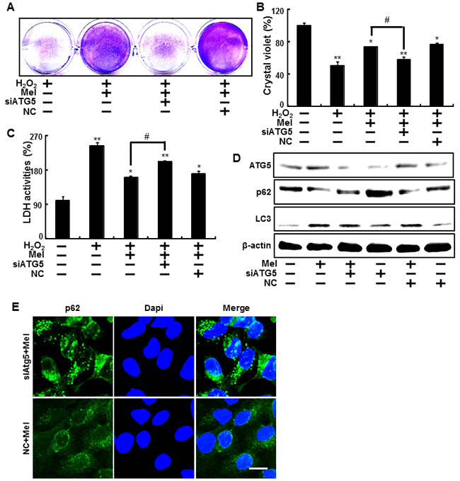 Figure 3: Inhibition of autophagy using ATG5 siRNA to counteract melatonin-related autophagy increases. ATG5 small interfering RNA (ATG5 siRNA) or negative control siRNA (NC siRNA) transfected HaCaT keratinocytes were incubated with 800 μM H2O2 for 18 hr in the presence of melatonin. Cell viability was measured using crystal violet staining. Viability of the control cells was set at 100% and viability relative to the control was measured A. B.. LDH activity was measured by quantifying LDH released in the medium C.. ATG5 siRNA or NC siRNA transfected HaCaT keratinocytes were incubated with melatonin for 24 hr. Western blot analysis of LC3-II and p62 proteins was conducted from the HaCaT keratinocytes. β-actin was used as a loading control D.. HaCaT keratinocytes were analyzed by immunocytochemistry for p62 E.. The cells were immunostained with p62 antibody (green) and observed in the fluorescent view. Scale bar: 10 μm. The bar graph indicates the mean ± standard error of the mean (SEM) (n = 4). * p < 0.05 and ** p < 0.01, represent significant differences between the control and each treatment group and # p < 0.01; significantly different when compared with H2O2 and melatonin-treated group.