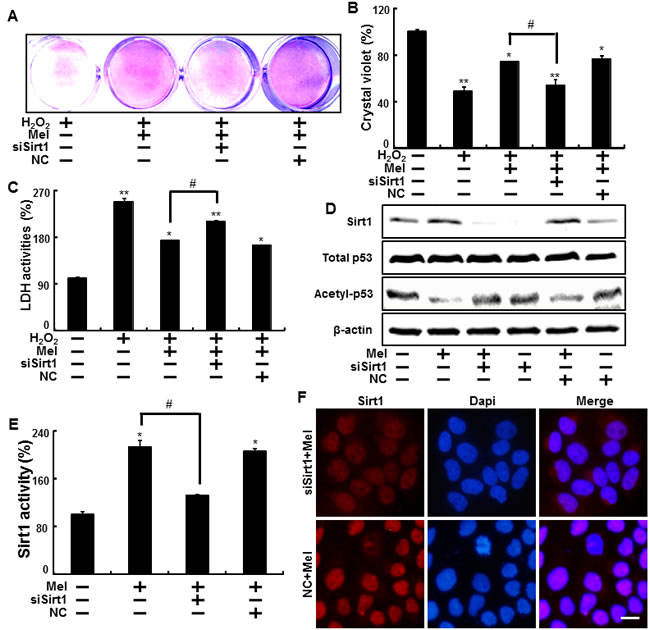 Figure 5: Blocking of sirt1 activity inhibited the melatonin-induced protection against hydrogen peroxide in keratinocyte. Sirt1 small interfering RNA (siSirt1) or negative control siRNA (NC siRNA) transfected HaCaT keratinocytes were incubated with 800 μM H2O2 for 18 hr in the presence of melatonin. The cell viability was measured by crystal violet staining. Viability of the control cells was set at 100%, and viability relative to the control was measured A., B. LDH activities were measured by quantifying LDH released in the medium C. siSirt1 or NC siRNA (negative control siRNA) transfected HaCaT keratinocytes were incubated with melatonin for 24 hr. Western blot for sirt1 and acetyl-p53 proteins was analyzed from HaCaT keratinocytes. β-actin was used as loading control D. Sirt1 deacetylase activities in nuclear were analyzed from HaCaT keratinocytes E. The cells were immunostained with sirt1 antibody (red) and observed in the fluorescent view Scale bar: 10 μm F. Bar graph indicates the mean ± standard error of the mean (SEM) (n = 4). * p < 0.05, ** p < 0.01 significant differences between control and each treatment group and # p < 0.01; significantly different when compared with H2O2 and melatonin-treated group.