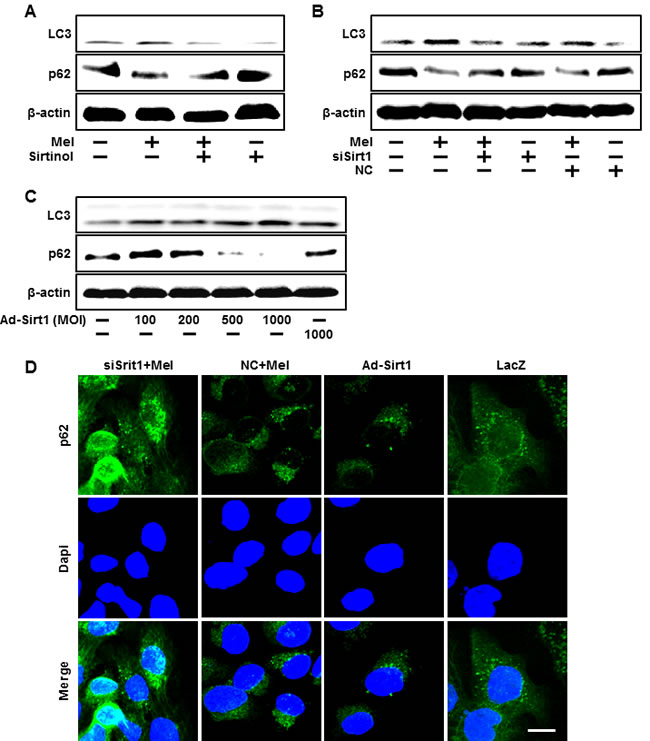 Figure 7: Blocking of sirt1 activity using siRNA and sirtinol inhibited the activation of autophagy flux by melatonin. HaCaT keratinocytes were incubated with melatonin in the presence of sirtinol for 24 hr. Total keratinocyte extracts were prepared and analyzed by Western blot for LC3-II and p62 protein levels A. Sirt1 small interfering RNA (siSirt1) or negative control siRNA (NC siRNA) transfected HaCaT keratinocytes were incubated with 10 μM of melatonin. Western blot for LC3-II and p62 proteins was analyzed from HaCaT keratinocytes B. HaCaT keratinocyte was transfected by overexpressing adenovirus (Ad-Sirt1) or lacZ-bearing adenovirus (Ad-lacZ). Western blot for LC3-II and p62 proteins were analyzed from HaCaT keratinocytes C. β-actin was used as loading control. The cells were immunostained with p62 antibody (green) and observed in the fluorescent view Scale bar: 10 μm D.
