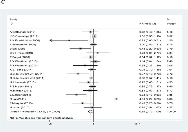 Figure 2: Forest plot of meta-analysis. In Figure 2A (overall survival analysis), 2B (overall survival analysis in colorectal cancer) and 2C (recurrence-free survival analysis), each study is shown by the point estimate of the hazard ratio (HR) and 95% confidence interval (CIs).