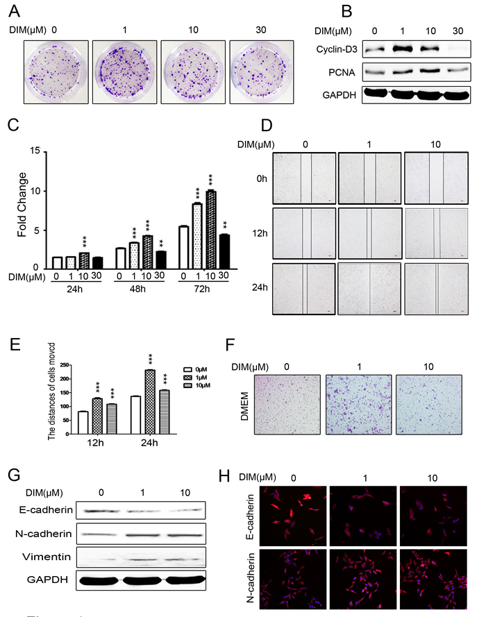 Figure 1: Low level of DIM promotes the proliferation and migration of gastric cancer cells. A. Representative images of colony formation in HGC-27 cells treated with 0, 1, 10, and 30 μM DIM. Original magnification, 40 Χ. B. Western blotting assays for the expression of Cyclin-D3 and PCNA proteins in HGC-27 cells treated with 0, 1, 10, and 30 μM DIM for 48 h. C. Cell counting assay for HGC-27 cells treated with 0, 1 , 10, and 30 μM DIM for 24, 48 and 72h. D. Wound healing assays for the migratory ability of HGC-27 cells at 12 and 24 h after the treatment with DIM (1 and 10 μM). Original magnification, 100Χ. E. The gap distance in A. was quantified. ***P < 0.001. F. The migratory ability of HGC-27 cells treated with 0, 1, and 10 μM DIM was evaluated by using transwell migration assay. Original magnification, 100 Χ. G. Western blotting assays for the expression of E-cadherin, N-cadherin, and Vimentin in HGC-27 cells treated with 0, 1, and 10 μM DIM for 48 h. H. Representative immunofluorescence images of E-cadherin and N-cadherin expression in HGC-27 cells treated with 0, 1, and 10 μM DIM for 48 h. Original magnification, 200 Χ.