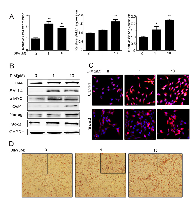 Figure 2: Low level of DIM enhances the stemness of gastric cancer cells. A. Real-time RT-PCR for the expression of Oct4, SALL4, and Sox2 genes in HGC-27 cells treated with 0, 1, and 10 μM DIM for 48 h. (n = 3, P < 0.05). B. Western blotting assays for the expression of CD44, SALL4, c-MYC, Oct4, Nanog, and Sox2 proteins in HGC-27 cells treated with 0, 1, and 10 μM DIM for 48 h. C. Immunofluorescent staining of CD44 and Sox2 proteins in HGC-27 cells treated with 0, 1, and 10 μM DIM for 48 h. Original magnification, 200Χ. D. Adipogenic differentiation of HGC-27 cells treated with 0, 1, and 10 μM DIM for 48 h. Original magnification, 200 Χ.