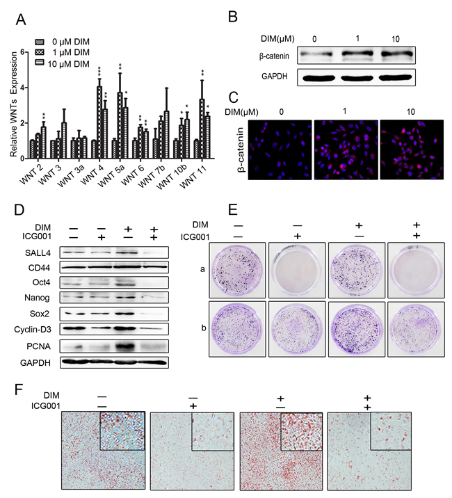 Figure 3: Low level of DIM activates β-catenin signaling to promote gastric cancer progression. A. Real-time RT-PCR for the expression of WNT2, WNT3, WNT3a, WNT4, WNT5a, WNT6, WNT7b, WNT10b, and WNT11 genes in HGC-27 cells treated with 0, 1, and 10 μM DIM for 48 h. (n = 3, P < 0.05). B. Western blotting assays for β-catenin expression in HGC-27 cells treated with 0, 1, and 10 μM DIM for 48 h. C. HGC-27 cells were treated with 0, 1, and 10 μM DIM for 48 h. The nuclear translocation of β-catenin was determined by using immunofluorescence staining. Original magnification, 200Χ. D. Western blotting assays for the expression of SALL4, CD44, Oct4, Nanog, Sox2, Cyclin-D3, and PCNA proteins in HGC-27 cells treated with 1 μM DIM in the presence or absence of ICG001 (10 μM/ml) for 48 h. E. Representative images of cell colonies in HGC-27 cells treated with 1 μM DIM in the presence or absence of ICG001 (10 μM/ml). A. HGC-27 were treated with 1 μM DIM and 10 μM ICG001 for 7 days. B. HGC-27 cells were treated with 1 μM DIM and 10 μM ICG001 for 48 h, and then collected for colony formation assay for 7 days. F. Adipogenic differentiation of HGC-27 cells treated with 1 μM DIM in the presence or absence of ICG001 (10 μM/ml) for 48 h. Original magnification, 200Χ.