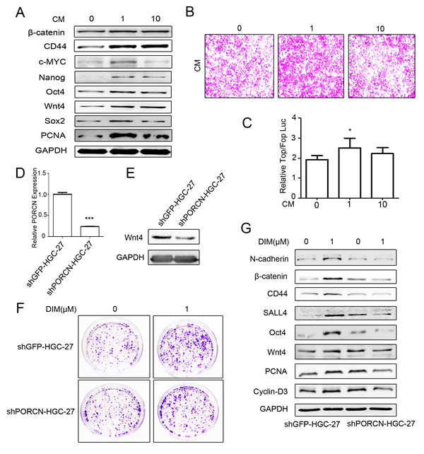 Figure 4: Low level of DIM activates β-catenin signaling by inducing Wnt autocrine. A. Western blotting assays for the expression of β-catenin, CD44, c-MYC, Nanog, Oct4, Wnt4, Sox2, and PCNA proteins in HGC-27 cells incubated with the conditioned medium form DIM-treated HGC-27 cells for 48 h. B. The conditioned medium in the lower chamber of the transwell was collected from HGC-27 cells treated with 0, 1, and 10 μM DIM for 48 h. Original magnification, 100Χ. C. HEK293T cells transfected with the TOP-Flash or FOP-Flash luciferase reporter were incubated with equal amounts of conditioned medium collected form HGC-27 cells that were treated with indicated concentrations of DIM for 48 h. The ratio between TOP & FOP Flash luciferase activity was determined at 24h after treatment (n = 3, *P < 0.05). D. HGC-27 cells were transfected with PORCN-shRNA (shPORCN-HGC-27) or GFP-shRNA (shGFP-HGC-27) lentivirus. The expression of PORCN in HGC-27 cells was determined by real-time RT-PCR. (n = 3, ***P < 0.001). E. Western blotting assays for Wnt4 expression in shGFP-HGC-27 and shPORCN-HGC-27 cells. F. Representative images of colony formation in shGFP-HGC-27 and shPORCN-HGC-27 cells treated with 0 and 1μM DIM. Original magnification, 40Χ. G. Western blotting assays for the expression of N-cadherin, β-catenin, CD44, SALL4, Oct4, Wnt4, and PCNA proteins in shGFP-HGC-27 and shPORCN-HGC-27 cells treated with 0 or 1 μM DIM for 48 h.