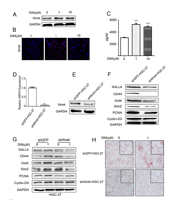 We next wanted to know whether the induction of Wnt4 by low level of DIM is critical for the activation of β-catenin in HGC-27 cells. We found that the expression of Wnt4 protein was increased in the gastric cancer cells treated with low level of DIM by using western blot (Figure 5A, Supplementary Figure 3B and 3D) and immunofluorescent staining (Figure 5B). To confirm these results, we collected the conditioned medium from HGC-27 cells treated with low level of DIM and detected Wnt4 protein levels by using ELISA. The results showed that the expression of Wnt4 was higher in HGC-27 cells treated with low level of DIM for 48 h than that in control cells (Figure 5C). We knocked down the expression of WNT4 in HGC-27 cells by using shRNA (shWNT4-HGC-27) (Figure 5D and 5E). The expression of PCNA, Cyclin-D3, CD44, SALL4, Oct4, Nanog, and Sox2 was decreased in shWNT4-HGC-27 cells (Figure 5F). The induced expression of PCNA, Cyclin-D3, SALL4, CD44, Oct4, and Sox2 in HGC-27 cells by low level of DIM was reversed by WNT4 knockdown (Figure 5G). The knockdown of WNT4 also inhibited the induced differentiation ability of HGC-27 by low level of DIM (Figure 5H). Taken together, these results suggest that low level of DIM promotes gastric cancer progression via Wnt4 autocrine.