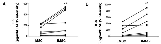 Figure 2: Increased secretion of senescence-associated cytokines by irradiated MSC. The production of IL-6 and IL-8 in iMSC (5Gy) and controls was evaluated by ELISA 9 days after irradiation. iMSC produced significantly higher levels of IL-6 A. and IL-8 B. compared to controls. Mean (triplicate) of 7 independent experiments are reported where (**) represents p ≤ 0.01.