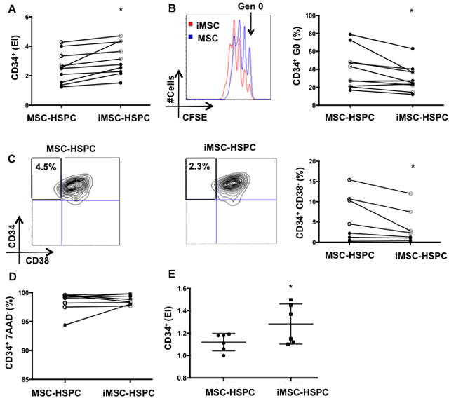 Figure 3: Senescent MSC reduce HSPC quiescence and the frequency of primitive CD34+CD38- cells. A. CD34+ expansion, B. percentage of CD34+ in generation 0, C. frequencies of CD34+CD38- subpopulations, and D. CD34+ viability were evaluated in MSC-HSPC and iMSC-HSPC (5Gy) co-cultures (1:1 ratio) following 4 days of co-culture. Open-faced circles represent MSC from pediatric donors (< 16 years-old) and black circles represent MSC from adult donors ( > 40 years-old). E. CD34+ proliferation was also evaluated following HSPC culture with conditioned medium from MSC and iMSC. Mean ±SD of 6-10 independent experiments are reported where (*) represent p ≤ 0.05.