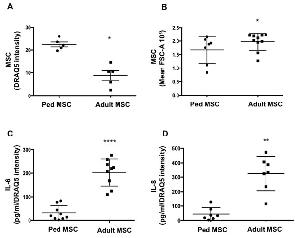 Figure 4: MSC from adult donors have a senescence-like phenotype. A. MSC were isolated from adult (> 40 years) and pediatric donors (< 16 years). MSC proliferation was measured by DRAQ5 intensity day 4 post seeding in adult and pediatric samples. B. Cell size was measured by flow cytometry (Mean FSC-A) in adult and pediatric MSC samples. C. IL-6 and D. IL-8 production by adult and pediatric MSC were quantified by ELISA. Mean ±SD of 7-10 independent experiments are reported where (*) represents p ≤ 0.05.