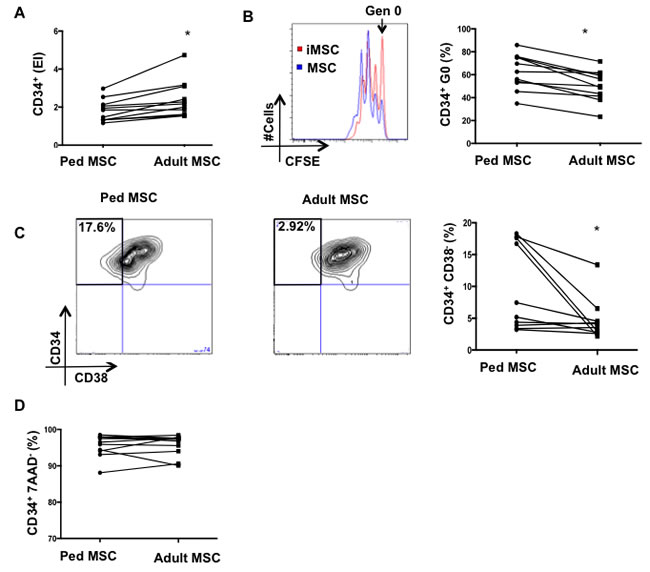 Taken together, these results reveal important functional differences between adult and pediatric MSC. In particular, consistent with their senescent-like characteristics, adult MSC display a decreased capacity to maintain CD34+ quiescence and CD34+CD38- subpopulations compared to pediatric MSC.