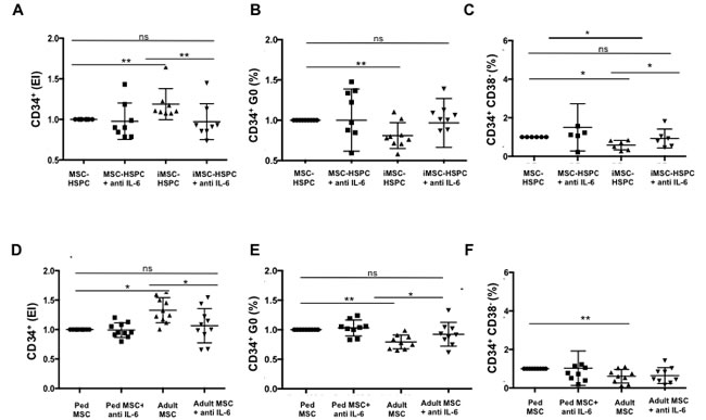 Given the elevated levels of secreted IL-6 by both irradiated and adult MSC and the relevance of IL-6 as a hematopoietin [21], we hypothesized that IL-6 played a role in promoting CD34+ expansion. To test this, we treated with an IL-6 neutralizing antibody iMSC and control co-cultures (Figure 6A-6C), and adult and pediatric MSC co-cultures (Figure 6D-6F).