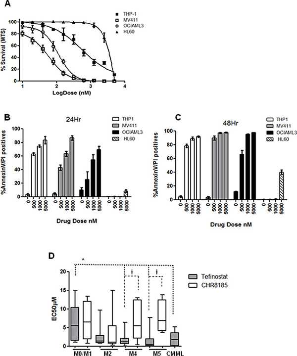 Figure 1: Monocytoid leukaemias show selective high sensitivity to Tefinostat. (A) Dose response plot for AML cell lines HL60 (M2), MV411 (M4), OCIAML3 (M4) and THP-1 (M5) treated with serial dilutions of Tefinostat. Tefinostat-induced Annexin V/PI incorporation measured by flow cytometry in THP1, MV411, OCIAML3 and HL60 at (B) 24 Hrs and (C) 48 Hrs post treatment. (D) Box and whiskers plots showing range of FAB type-specific MTS-derived EC50s in response to Tefinostat and the comparative non hCE-1-dependent t-butyl analogue CHR8185 in a cohort of 66 primary AML and 7 primary CMML samples. (Tefinostat EC50 M4/M5/CMML vs. M0/M1 *p = 0.009 spearman’s correlation. Tefinostat vs. t-butyl analogue CHR8185, only significant in M4/M5 groups ǂp < 0.007).