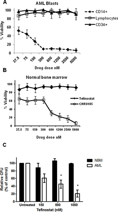 Figure 2: Monocytic targeting of HDACi therapy spares normal bone marrow progenitor cells. (A) Flow cytometric analysis of viability of cell subpopulations in primary AML samples in response to Tefinostat dosing measured by 7AAD exclusion (n = 8). (B) Dose response effects of Tefinostat and CHR8185 in NBM cells (n = 4) measured by 7AAD exclusion. (C) Tefinostat effects on Colony forming units (CFUs) in NBM CD34+ cells (no significant difference, n = 4) and primary AML blasts (*p < 0.02 MWU, n = 6) following 14 days culture on methocult.