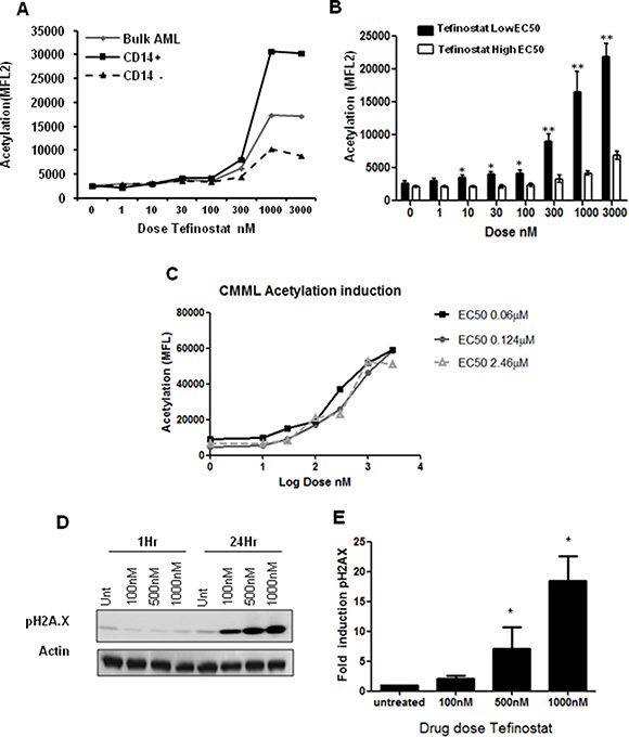 Figure 4: Increases in intracellular acetylation and DNA damage induction are biomarkers of Tefinostat efficacy. (A) Tefinostat dose-dependent intracellular acetylation staining in a representative primary AML sample using acetylated lysine monoclonal antibody and sub-population analysis by flow cytometry. (B) Acetylation induction in Tefinostat sensitive (low EC50/CD14+ black bars, n = 8) compared to insensitive (high EC50, white bars, n = 5) primary AML samples, *p < 0.05, **p < 0.005. (C) Tefinostat dose-dependent intracellular acetylation induction in primary CMML samples (n = 3). All samples exhibit > 80% CD14+ and > 70% hCE-1 expression. (D) Representative western blot of phospho-H2A.X induction by tefinostat at 1 and 24 hours post-treatment. (E) Western blot quantification of dose-dependent tefinostat-induced γ-H2A.X induction at 24 hrs compared to vehicle treated control (n = 9 AML samples, *p < 0.01 Kruskal Wallis).