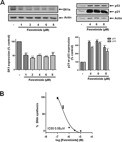 Figure 4: Effect of fenretinide on SK1a, p21 and p53 expression. LNCaP-AI cells were treated with fenretinide for 24 h. (A) Western blot showing the effect of fenretinide (1–8 μM) on the expression of SK1a, p21 and p53. Results are representative of at least three independent experiments. Actin was used a protein loading control. Also shown are bar graphs of the quantification of the effect of fenretinide on SK1a, p53 and p21 expression. Results are expressed as means +/− SD for n = 3 experiments. ***p < 0.001 versus control; (B) The effect of fenretinide on [3H]thymidine incorporation. Results are expressed as means +/− SD for n = 3 experiments.
