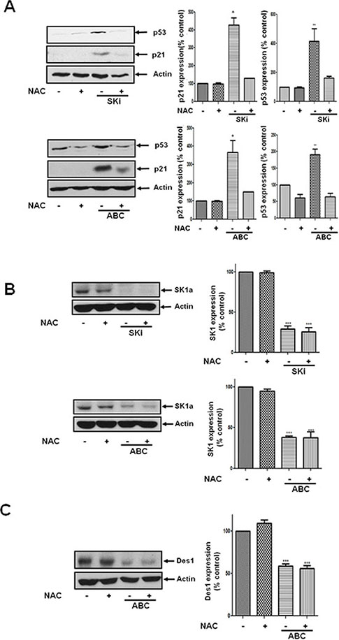 Figure 5: Effect of NAC on the ABC294640- or SKi-induced increase in p21 and p53 expression and the lack of effect on SK1a expression. LNCaP-AI cells were pre-treated with or without NAC (10 mM) for 30 min prior to treatment with ABC294640 (25 μM) or SKi (10 μM) for 48 h. (A) Western blot showing the effect of NAC on the ABC294640- or SKi-induced increase in p53 and p21 expression; (B) Western blot showing the lack of effect of NAC on the ABC294640- or SKi-induced proteasomal degradation of SK1a; (C) Western blot showing the lack of effect of NAC on the ABC294640-induced proteasomal degradation of Des1. In (A-C) actin was used as a protein loading control. Western blot results are representative of at least three independent experiments. Also shown are bar graphs of the quantification of the effect of NAC (10 mM) on SK inhibitor induced in changes in p21, p53, SK1a and Des1 expression. Results are expressed as means +/− SD for n = 3 experiments. *p < 0.05 versus control, ***p < 0.001 versus control.