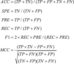 Predicting a binding site as hot spot or non-hot spot is a binary classification problem, and many measures have been introduced for validation issues. Here the prediction performances are evaluated by the overall prediction accuracy (ACC), specificity (SPE), precision (PRE), recall (REC), F1 score, and the Matthew’s correlation coefficient (MCC). These measures are defined as,
