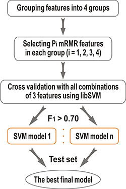 In our second step, we used the similar method in our previous work [20]. We first selected 2 features from the selected 36 features. Then we added one feature each time until the F1 score and MCC was improved. And we used support vector machines (SVM) to evaluate the features by 10-fold cross-validation. After that, we combined features from different classes to create diverse feature combination sets.