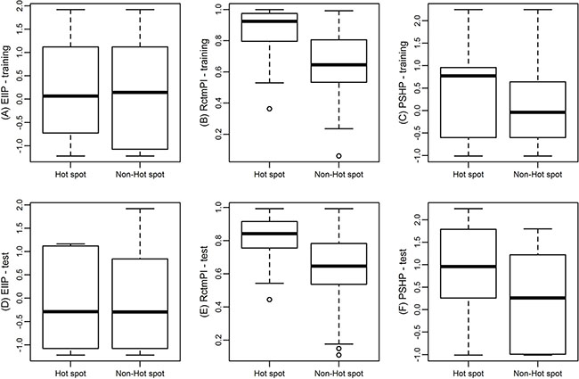 (Figure 4A) shows the box plot of EIIP between hot spots and non-hot spots in the training set. The median value of EIIP of hot spots and non-hot spots is 0.0646 and 0.1442, respectively with a P-value of 0.714 (Table 4). According to the P-value, EIIP may not be a good feature to distinguish hot spots from non-hot spots by itself. However, in Nguyen et al. [25]. They use frequency-related features involved physicochemical characteristic such as electron-ion interaction potentials and ionization constants to predict hot spots and get a high F1. Their results brought evidence to support the conjecture of Cosic et al. [26]. That protein hot spots are associated with frequency features of physicochemical characteristics of the amino acid sequence. Meanwhile, we tested the result without the feature using the same method and got the best F1 of 0.52 and the best recall of 0.61, which were far from our performance. It means that EIIP is an important feature even that it has not good ability to discriminate hot spots and non-hot spots when used alone.
