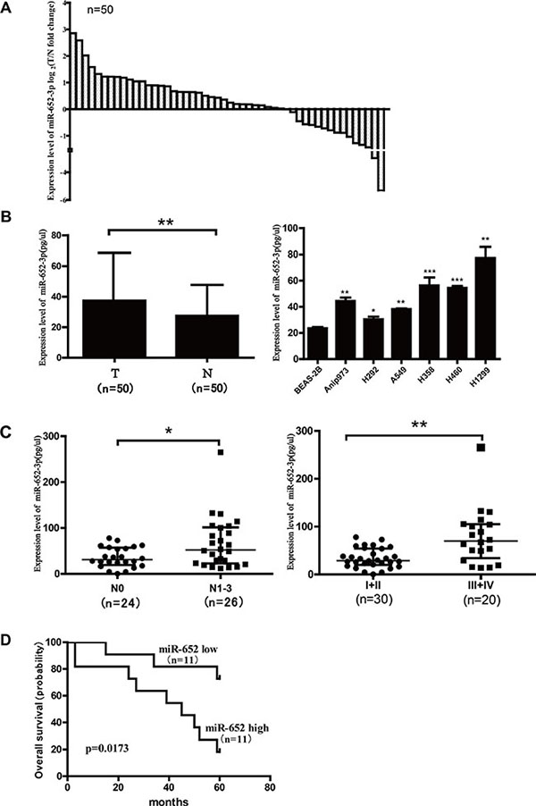 miR-652-3p expression is upregulated in NSCLC tumor tissues and cell lines and correlated with the disease progression of patients with NSCLC