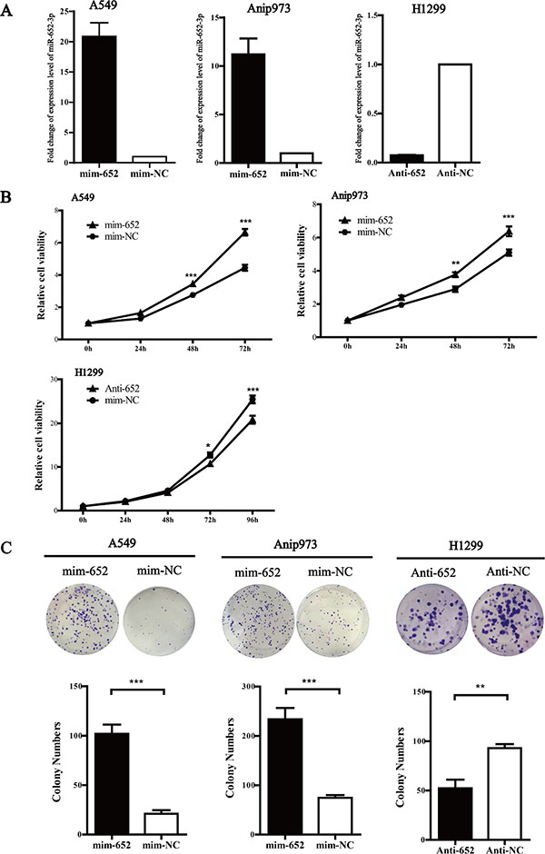 Figure 2: MiR-652-3p promotes cell proliferation. (A) The miR-652-3p expression in A549 and Anip973 cells transfected with miR-652-3p mimics for 48 hours were compared with mimics negative control, and the expression of miR-652-3p in H1299 cells transfected with miR-652-3p inhibitor for 48 hours was compared with inhibitor negative control. The NC was set as 1. The column represents the mean of fold change for three independent experiments, bar represents S.E.M, each experiment performed in triplicates, t test was uesd. (B) The cell proliferation ability were compared between the miR-652-3p mimics transfection and mimics negative control in A549 and Anip973 cells, or miR-652-3p inhibitor transfection and inhibitor negative control in H1299 cells. The proliferation rate was calculated by dividing OD450 of 24, 48 and 72 hours by that of 0 hours after transfection. The difference of proliferation rate in 24, 48 and 72 hours between groups were copmared, point represents mean of three independent experiments, bar represents S.E.M, each experiment performed in triplicates, t test was uesd. (D) The colony formation ability was compared between miR-652-3p mimics or inhibitor transfection and negative control group, and the number of clones were counted. Column, mean of three independent experiments, bar, S.E.M, each experiment performed in triplicates, t test was uesd. *p < 0.05, **p < 0.01 and ***p < 0.001.