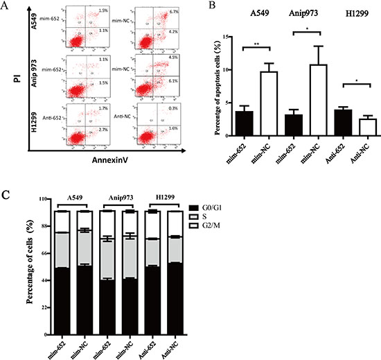 To further investigate the mechanism of how miR-652-3p regulating the proliferation of NSCLC cell, we analyzed the effect of miR-652-3p on cell cycle and apoptosis using a flow cytometry assay. The results showed that mim-miR-652-3p significantly inhibited the apoptosis of A549 and Anip973 cells, while anti-miR-652-3p markedly increased the apoptosis of H1299 cells (Figure 3A, 3B). However, no significant difference of cell cycle were observed after the upregulation or knockdown of miR-652-3p in NSCLC cells (Figure 3C). These results suggested that miR-652-3p regulated cell proliferation mainly through suppressing the apoptosis of NSCLC cells.
