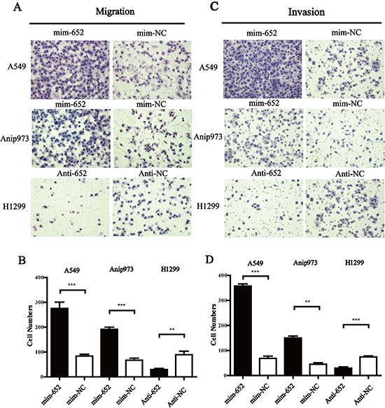Figure 4: MiR-652-3p promotes the migration and invasion of NSCLC cells. Twenty-four hours after miRNA transfection, serum was removed and cells were cultured in serum-free medium for 12 hours. Cells were plated into the upper chamber of 24-well transwell inserts uncoated or coated with Matrigel for migration or invasion assay for 12–24 hours. The cells on the lower side of the chamber without Matrigel (A) or coated with Matrigel (C) were fixed, stained and counted in three different areas at 100-fold magnification. The cell numbers of migration (B) and invasion (D) were compared between goups. Column, mean of three independent experiments, bar, S.E.M, each experiment performed in triplicates, t test was uesd. **p < 0.01 and ***p < 0.001.