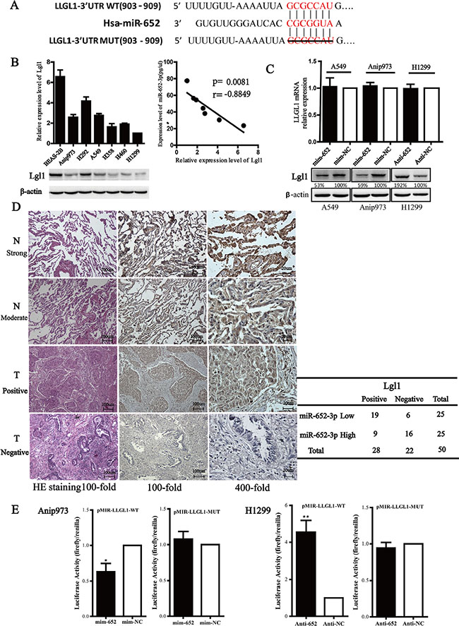 Figure 5: Lgl1 is a direct target of miR-652-3p. (A) The three public miRNA databases (miRDB, miRanda and DIANA) predicted that LLGL1 might be a target for miR-652-3p, and the 3′-UTR of LLGL1 mRNA contains a highly conserved and perfect complementary region from position 903 to 909 for biding the seed sequence of miR-652-3p. A 112 nt nucleotide sequence of LLGL1 mRNA 3′UTR containing the predictive miR-652-3p binding seed sequence were synthesized and inserted to construct pMIR-LLGL1-WT, and the truncated mutation of the above nucleotide sequence lacking the 7 nt seed sequence were inserted to construct the pMIR-LLGL1-Mut vector. (B) The total proteins were isolated from 6 NSCLC cells and a normal bronchus epithelial cell line for Lgl1 detection by Western blotting, β-actin was used as the loading control. The gray density was quantified, and the relative expression was calculated by dividing the Lgl1 by β-actin. The correlation of Lgl1 expression and miR-652-3p level was ananlyzed using Pearson’s chi-square test. Column, mean of three independent experiments, bar, S.E.M. (C) The level of LLGL1 mRNA was examined using qRT-PCR in A549 and Anip973 cells transfected with miR-652-3p mimics or mim-NC as well as in H1299 cells transfected with the miR-652-3p inhibitor or anti-NC for 48 hours. GAPDH mRNA was used as an internal control. The NC was set as 1. Column, mean of three independent experiments, bar, S.E.M, each experiment performed in triplicates, t test was uesd (top). The Lgl1 protein level was detected by Western blotting, the gray density and relative expression level was shown (bottom). (D) The expression of Lgl1 in 50 tumor tissues (T) and adjacent normal tissues (N) was examined by IHC (left). The correlation between miR-652-3p level and Lgl1 expression in tumor tissues was analyzed by Fisher’s exact test (right). (E) Cells were transfected with miR-652-3p mimics in A549 cells or inhibitor in H1299 cells for 24 hours followed by transfection with pMIR-LLGL1-Wt/Mut reporter plasmids along with phRL-TK. Luciferase activity was measured using a dual-luciferase reporter assay. The relative luciferase activity was calculated by LUCfirefly/LUCrenilla, the fold change of mimics or inhibitor compare to negative control was shown. The NC was set as 1. Column, mean of three independent experiments, bar, S.E.M, each experiment performed in triplicates, t test was uesd. *p < 0.05 and **p < 0.01.