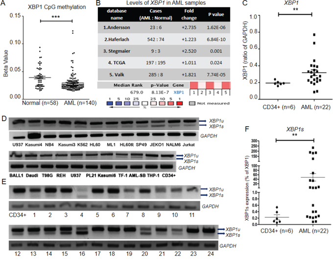 Figure 1: XBP1 and XBP1s are up-regulated in AML. A. The methylation status of the CpG islands of XBP1 in normal donors (n=58) and AML samples (n=140) was analyzed using TCGA level 3 database. The p-values were calculated by student t test. B. 5 publicly available microarray databases showed XBP1 was highly expressed in AML samples compared with normal BM samples. 1. Andersson Leukemia [84]; 2. Haferlach [85]; 3. Stegmaier [86]; 4. TCGA [87]; 5. Valk [88]. The rank for a gene is the median rank for that gene across each of the analyses. The p-value refers to the median-ranked analysis. C. QRT-PCR analysis of AML blast cells from patients (n=22) compared with normal human CD34+ cells (n=6) showed significant up-regulation of XBP1, using GAPDH as an internal control (p<0.01). D, E. RT-PCR and gel electrophoresis identified XBP1s activation in human leukemia cell lines (D) and samples from normal (CD34+) and AML blast cells from patients (1-24) (E). F. QRT-PCR analysis of XBP1s expression in AML blast samples from patients (n=22) and normal human CD34+ cells (n=6). Figures are representative example of 3 replicates. Data represent mean ± SD. XBP1s, spliced XBP1.