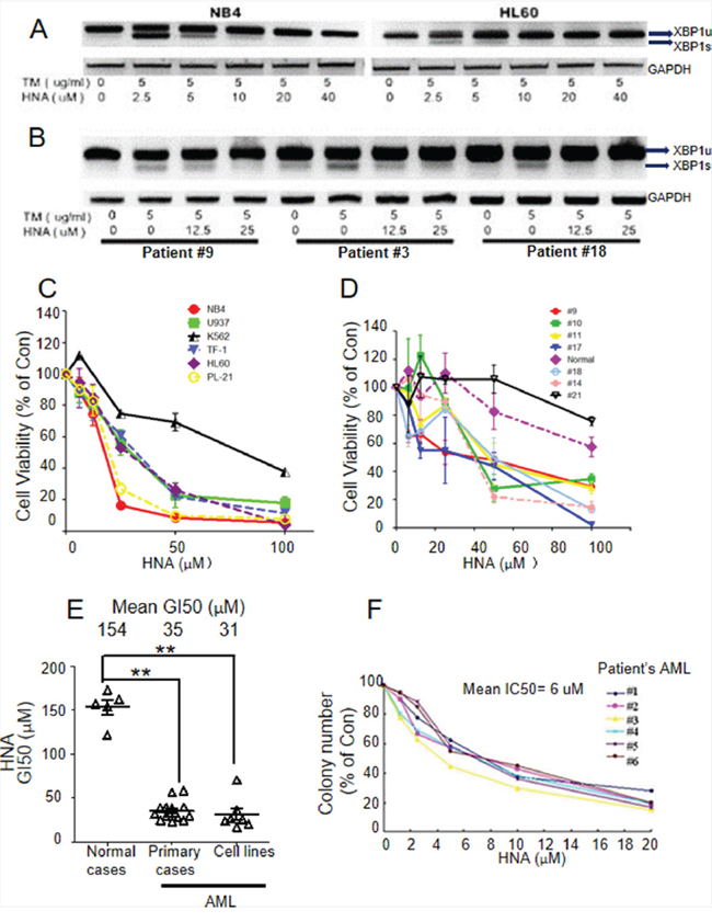 Figure 2: HNA inhibits XBP1s and causes cytotoxicity of AML cells. A, B. HNA inhibited XBP1s expression induced by tunicamycin (TM) in human AML cells lines (A) and AML blast cells from patients (B). Cells (106) were incubated with indicated concentrations of either TM or TM and 2-hydroxy-1-naphthaldehyde (HNA) in 6-well plates for 6 h. RNA was isolated and RT-PCR was performed to examine XBP1u and XBP1s expression by gel electrophoresis. C, D. Cell viability analysis examined IRE1 inhibitor induced cytotoxicity of human AML cell lines (C) and AML blast samples from normal and AML patients (D). Cells (10,000) were added into 96-well plates followed by exposure to various concentrations of HNA. Cell viability (MTT assay) was examined 72 h later. E. Concentration for 50% of maximal inhibition of cell proliferation (GI50) of HNA for 15 AML patient samples and 7 AML cell lines (NB4, U937, K-562, TF-1, HL-60, PL-21 and THP-1) calculated from data shown in Figures 2C and 2D. “Con”, untreated control. The GI50s were calculated by Graphpad software. F. Soft agar clonogenic assays of 6 AML patient samples exposed to HNA. Figures are representative example of 3 replicates. GI50s were calculated. Data represent mean ± SD, n=3.