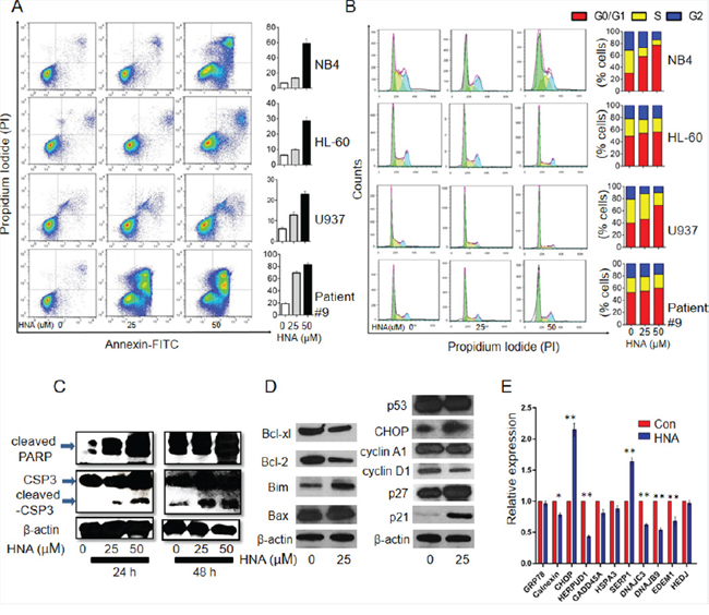 Figure 3: IRE1α inhibition induced apoptosis and G1 cell cycle arrest in AML cells. A. AML cells (NB4, HL-60, U937 and AML patient sample #9) were treated with HNA (25μM, 50μM) for 24 h and Annexin/PI assays were conducted to evaluate HNA induced apoptosis. Right side bar graphs show percent apoptotic cells (positive Annexin V + PI) in each treatment group. B. AML cells (NB4, HL-60, U937 and AML patient sample #9) were treated with HNA (25μM and 50μM) for 24 h and stained with PI. Cell cycle was analyzed by Flowjo software. Right panel, bar graphs displayed cell cycle phase distribution in each treatment group. Cells cultured with diluent were used as control (Con). C. NB4 cells were treated with HNA (25 μM, 50 μM) for either 24 or 48 h and western blotting evaluated expression of cleaved PARP and cleaved caspase-3. β-actin was used as loading control. D, E. NB4 cells were treated with HNA (25 μM, 48 h) and expression of Bcl-2 family and cell cycle associated proteins were evaluated by western blotting (β-actin, loading control) (D); mRNA levels of chaperone genes were measured by QRT-PCR (E). Relative expression of each gene was normalized to GAPDH mRNA; and for each gene, control levels were considered to be 1.0. Figures (A, B, E) are representative example of 3 replicates. Data represent mean ± SD, n=3.