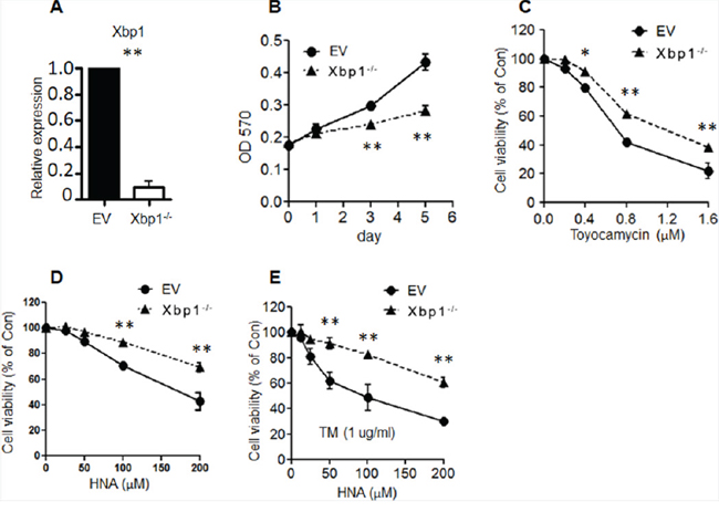 Figure 4: Knock-out Xbp1 induced myeloid cell resistance to IRE1 inhibitors. A. Xbp1 flox/flox murine bone marrow cells were infected with a retroviral vector that expressed either the Cre recombinase or empty vector (EV); these cells were stably selected with G418 followed by addition of 4-OHT (1μM) for two days to obtain either Cre-mediated Xbp1 knock-out (Xbp1-/-) or empty vector (EV) Xbp1fl/fl myeloid cells. QRT-PCR was performed to measure knock-out effenciency of Xbp1. B. Xbp1-/- and EV marrow cells (1,000) were seeded into 96-well plates, and cell proliferation was measured on days 1, 3 and 5. (MTT assay) (n=3). C-E. Xbp1-/- and EV marrow cells were (1,000) seeded into 96-well plates and followed by treatment with increasing concentrations of IRE1 inhibitor [Toyocamycin alone (C); HNA alone (D); HNA or TM plus HNA (E)]. After 72h, cell viability was measured (MTT assay). Data represent mean ± SD, n=3.