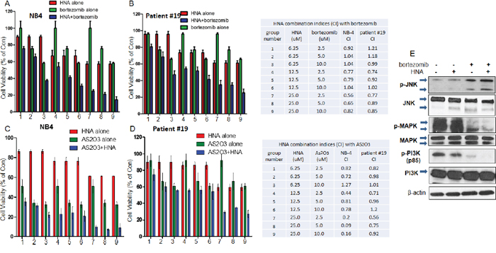 Figure 5: Combination of HNA with either bortezomib or AS2O3 NB4. A, C. or #19 primary AML blast cells B, D. were seeded (10,000) in 96-well plates and treated with HNA (0, 6.25, 12.5 and 25 μM) and/ or bortezomib (0, 2.5, 5, 10 μM) (A, B) or HNA and/or AS2O3 (0, 2.5, 5, 10 μM) (C, D) for 72 h; and cell viability was measured (MTT assay). Data are presented as percentage of diluent treatment control (Con). Data represent mean ± SD, n=3. CI (<1, synergistic; =1, additive; >1, antagonistic). E. NB4 cells were treated with HNA (25 μM) and/or botezomib (5 μM) for 48 h, and expression of total and phosphorylated (p-) JNK, MAPK and PI3K were evaluated by western blotting (β-actin, loading control).