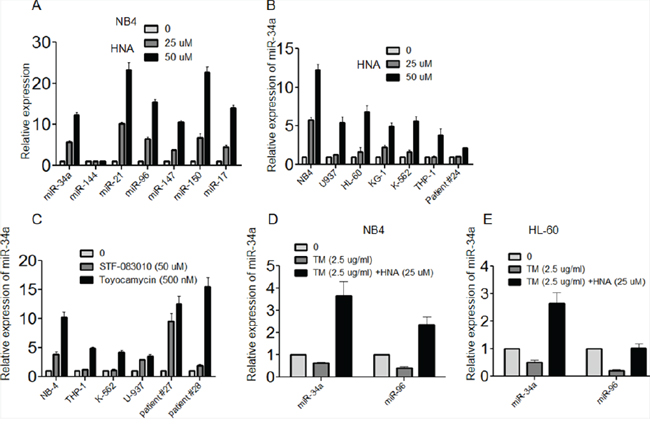 Figure 6: Inhibition of IRE1α increased expression of miRs in AML cells. A. NB4 cells were treated with HNA (0, 25, 50 μM) for 24h and expression of pre-miR- 34, -144, -21, -96, -147 and -150 was measured by QRT-PCR. Cells without HNA were used as control. B. QRT-PCR analysis of pre-miR-34a expression level in NB4, U937, HL-60, KG-1, K-562 and THP-1 AML cell lines and primary AML blast sample #24 upon HNA (25 μM) treatment for 24 h. C. QRT-PCR analysis of pre-miR-34a expression level in NB4, THP-1, K-562 and U937 AML cell lines and primary AML blast cell samples #27 and #28 after exposure to either STF-083010 (50 μM) or Toyocamycin (500 nM) for 24 h. D, E. NB4 or HL-60 cells were treated with either TM (2.5 μg/ml) alone or TM and HNA (25 μM) for 12 h; expression levels of pre-miR-34a and miR-96 were measured by QRT-PCR. Relative expression of each gene was normalized to GAPDH. Data represent mean ± SD, n=3.