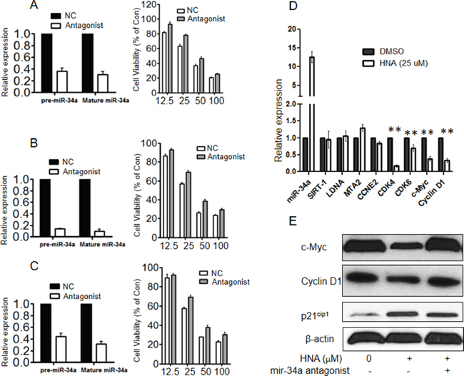 Small RNA antagonist against miR-34a was transiently transfected into 3 AML cell lines (K562, NB4, U937), and cell viability was examined after treatment with HNA (12.5-100 μM). Knockdown efficiency of miR-34a by the antagonist was validated both at the pre- and mature miR level by QRT-PCR (Figures 7A-7C, left panels). Inhibition of miR-34a conferred modest survival advantage compared to HNA alone in these AML cells (Figures 7A-7C, right panels). In addition, HNA inhibited transcriptional levels of several targeted genes of miR-34a (c-Myc, cyclin D1, CDK4) in NB4 cells (Figure 7D); Also in the AML cells, the miR-34a antagonist restored protein expression levels of c-Myc and cyclin D1 proteins, these had been inhibited in their expression in the presence of HNA alone. (Figure 7E).