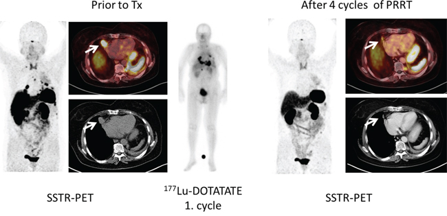 Figure 3: Example of SSTR-positive SCLC in a patient undergoing PRRT (patient #2). Given are maximum intensity projections as well as transaxial slices of SSTR-PET/CT in an SCLC patient (patient #2) prior to (left) and after (right) peptide receptor radionuclide therapy (PRRT). The patient had previously undergone 1st- (carboplatin/etoposid) and 2nd- (topotecan) line chemotherapy and presented with progressive disease. 68Ga-DOTATATE PET demonstrated intense expression of somatostatin receptors and SSTR-directed therapy was subsequently performed. After 4 cycles of PRRT, partial response could be recorded.